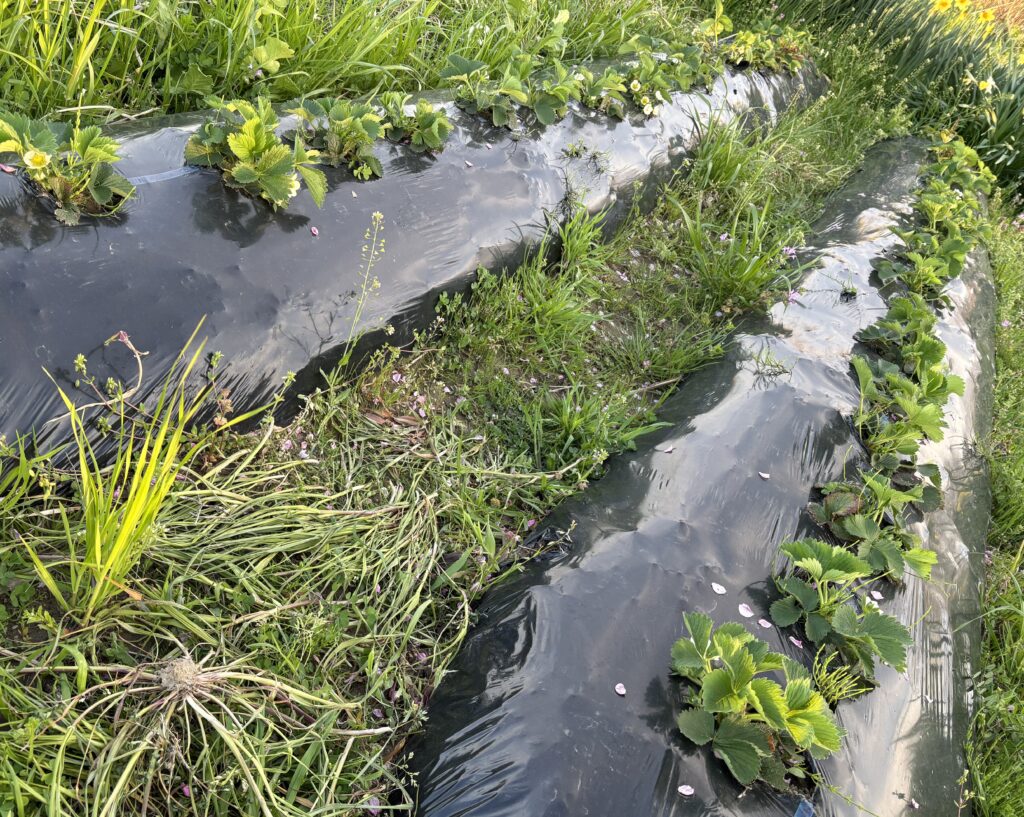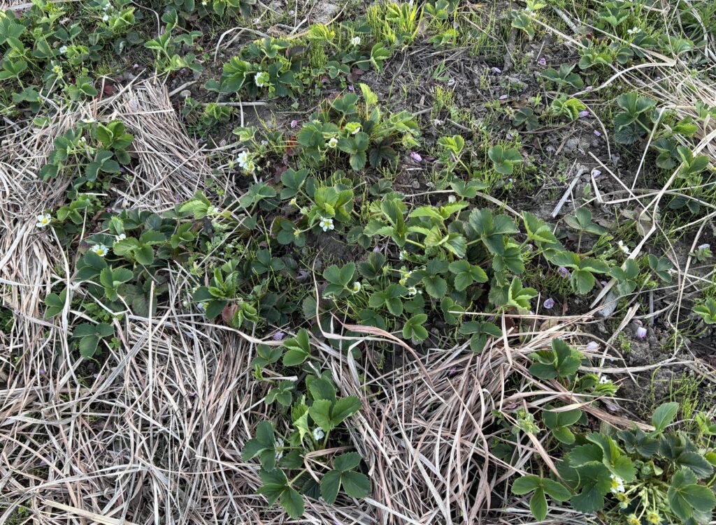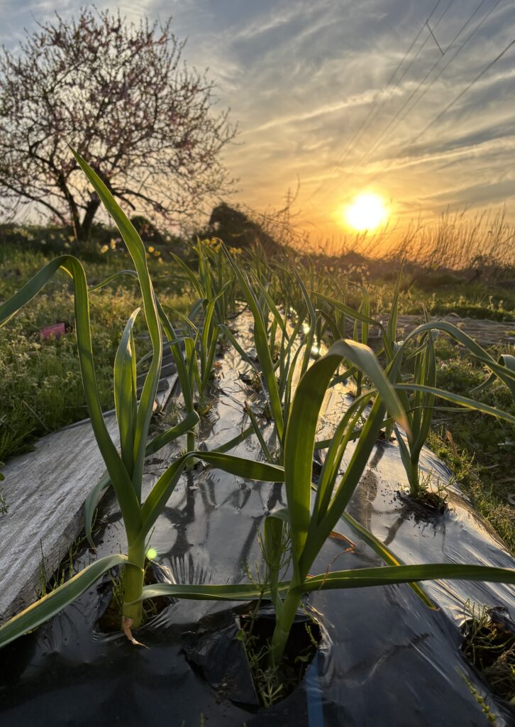 ニンニクもイチゴも、春の光に応えるように伸びている。